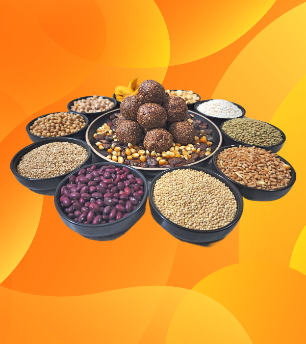 *Frijol rojo, frijol mungo, cacao, mijo, garbanzo, lenteja, cacahuate, amaranto, ajonjolí, plátano deshidratado, maíz y 2gr de fruto seco deshidratado.